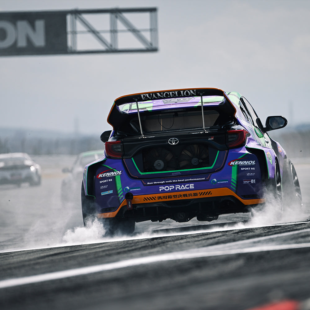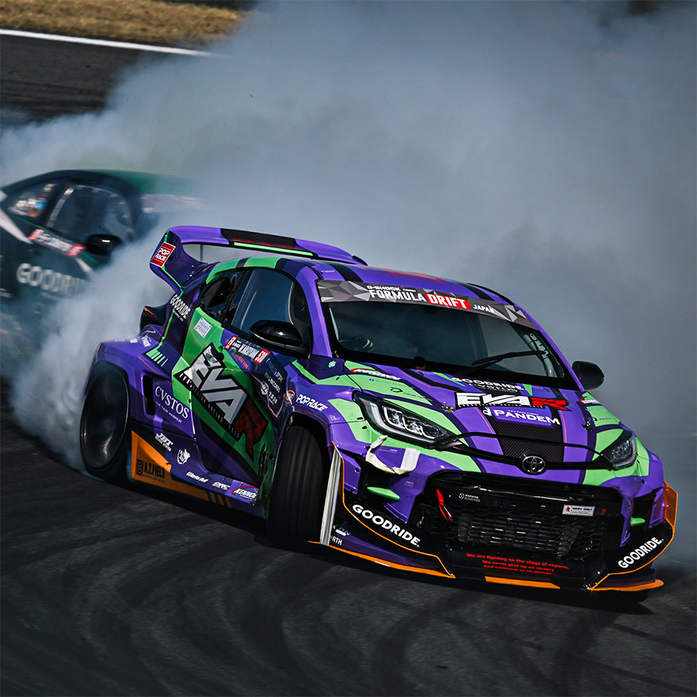 ※2024年、エヴァンゲリオンレーシングはGOODRIDE MOTORSPORTSとタッグを組み「FORMULA DRIFT JAPAN 2024」にフル参戦しており、ミニカーのモデルとなった初号機カラーのGRヤリスは富士スピードウェイにて行われたラウンド1のみの限定カラーとして登場致しました。